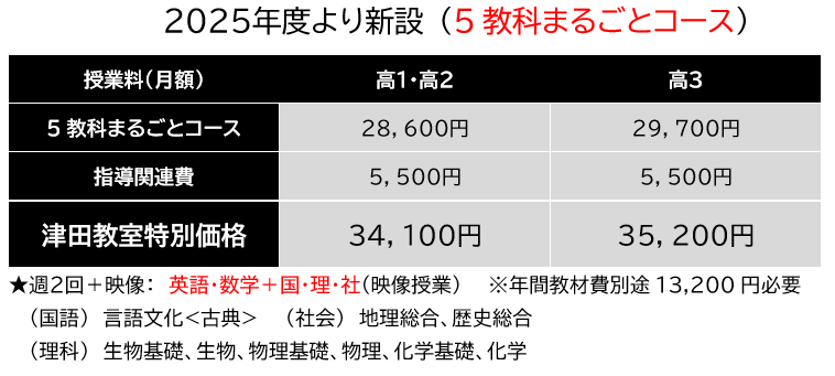 ※ 上記料金は、津田教室のみに適用します。